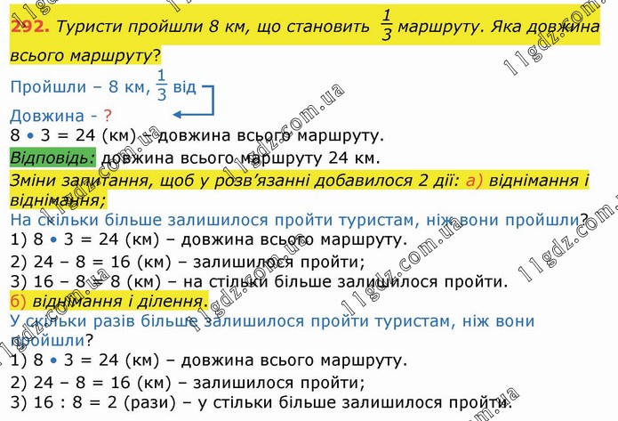Туристи пройшли 8 км, що становить 1/3 маршруту. Яка довжина всього маршруту? Пройшли – 8 км, 13 від Довжина - ? 8 • 3 = 24 (км) – довжина всього маршруту. Відповідь: довжина всього маршруту 24 км. Зміни запитання, щоб у розв’язанні добавилося 2 дії: а) віднімання і віднімання; На скільки більше залишилося пройти туристам, ніж вони пройшли? 1) 8 • 3 = 24 (км) – довжина всього маршруту. 2) 24 – 8 = 16 (км) – залишилося пройти; 3) 16 – 8 = 8 (км) – на стільки більше залишилося пройти. б) віднімання і ділення. У скільки разів більше залишилося пройти туристам, ніж вони пройшли?