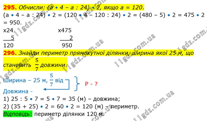 295. Обчисли: (а • 4 – а : 24) • 2, якщо а = 120. (а • 4 – а : 24) • 2 = (120 • 4 – 120 : 24) • 2 = (480 – 5) • 2 = 475 • 2 = 950. 296. Знайди периметр прямокутної ділянки, ширина якої 25 м, що становить 5/7 довжини. Ширина – 25 м, 5/7 від Довжина - 1) 25 : 5 • 7 = 5 • 7 = 35 (м) – довжина; 2) (35 + 25) • 2 = 60 • 2 = 120 (м) – периметр. Відповідь: периметр ділянки 120 м.