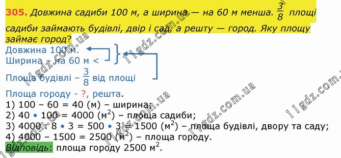 Довжина садиби 100 м, а ширина — на 60 м менша. 3/8 площі садиби займають будівлі, двір і сад, а решту — город. Яку площу займає город? Довжина 100 м. Ширина – на 60 м < Площа будівлі – 38 від площі Площа городу - ?, решта. 1) 100 – 60 = 40 (м) – ширина; 2) 40 • 100 = 4000 (м2) – площа садиби; 3) 4000 : 8 • 3 = 500 • 3 = 1500 (м2) – площа будівлі, двору та саду; 4) 4000 – 1500 = 2500 (м2) – площа городу. Відповідь: площа городу 2500 м2.