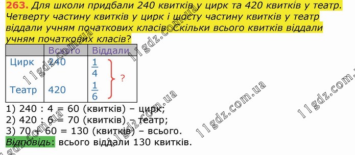 Для школи придбали 240 квитків у цирк та 420 квитків у театр. Четверту частину квитків у цирк і шосту частину квитків у театр віддали учням початкових класів. Скільки всього квитків віддали учням початкових класів?