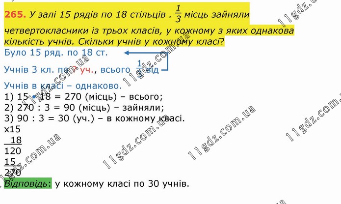 У залі 15 рядів по 18 стільців . 1/3 місць зайняли четвертокласники із трьох класів, у кожному з яких однакова кількість учнів. Скільки учнів у кожному класі?