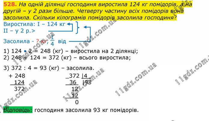 На одній ділянці господиня виростила 124 кг помідорів, а на другій – у 2 рази більше. Четверту частину всіх помідорів вона засолила. Скільки кілограмів помідорів засолила господиня?