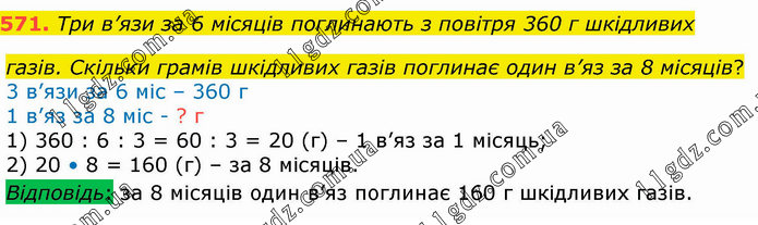 Три в’язи за 6 місяців поглинають з повітря 360 г шкідливих газів. Скільки грамів шкідливих газів поглинає один в’яз за 8 місяців? 3 в’язи за 6 міс – 360 г 1 в’яз за 8 міс - ? г 1) 360 : 6 : 3 = 60 : 3 = 20 (г) – 1 в’яз за 1 місяць; 2) 20 • 8 = 160 (г) – за 8 місяців. Відповідь: за 8 місяців один в’яз поглинає 160 г шкідливих газів.