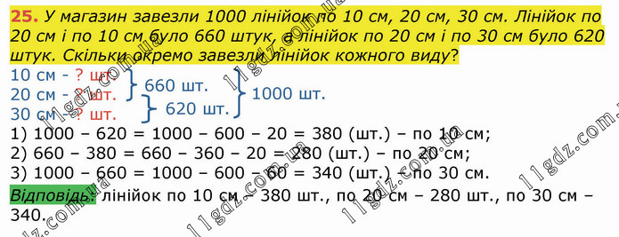 У магазин завезли 1000 лінійок по 10 см, 20 см, 30 см. Лінійок по 20 см і по 10 см було 660 штук, а лінійок по 20 см і по 30 см було 620 штук. Скільки окремо завезли лінійок кожного виду? 10 см - ? шт. 20 см - ? шт. 30 см - ? шт. 1) 1000 – 620 = 1000 – 600 – 20 = 380 (шт.) – по 10 см; 2) 660 – 380 = 660 – 360 – 20 = 280 (шт.) – по 20 см; 3) 1000 – 660 = 1000 – 600 – 60 = 340 (шт.) – по 30 см. Відповідь: лінійок по 10 см – 380 шт., по 20 см – 280 шт., по 30 см – 340.