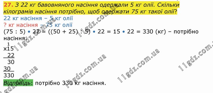З 22 кг бавовняного насіння одержали 5 кг олії. Скільки кілограмів насіння потрібно, щоб одержати 75 кг такої олії? 22 кг насіння – 5 кг олії ? кг насіння – 75 кг олії (75 : 5) • 22 = ((50 + 25) : 5) • 22 = 15 • 22 = 330 (кг) – потрібно насіння.