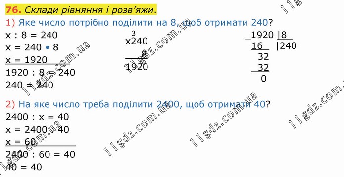 Склади рівняння і розв’яжи. 1) Яке число потрібно поділити на 8, щоб отримати 240? х : 8 = 240 х = 240 • 8 х = 1920____ 1920 : 8 = 240 240 = 240 На яке число треба поділити 2400, щоб отримати 40? 2400 : х = 40 х = 2400 : 40 х = 60_______ 2400 : 60 = 40 40 = 40