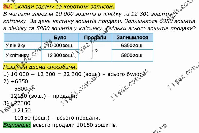 Склади задачу за коротким записом. В магазин завезли 10 000 зошитів в лінійку та 12 300 зошитів у клітинку. За день частину зошитів продали. Залишилося 6350 зошитів в лінійку та 5800 зошитів у клітинку. Скільки всього зошитів продали? Розв’яжи двома способами. 1) 10 000 + 12 300 = 22 300 (зош.) – всього було;
