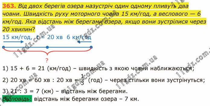 Від двох берегів озера назустріч один одному пливуть два човни. Швидкість руху моторного човна 15 км/год, а веслового — 6 км/год. Яка відстань між берегами озера, якщо вони зустрілися через 20 хвилин? 15 км/год, t = 20 хв 6 км/год ? 1) 15 + 6 = 21 (км/год) – швидкість з якою човни наближаються; 2) 20 хв = 60 хв : 20 хв = 13 (год) – через стільки вони зустрінуться; 3) 21 : 3 = 7 (км) – відстань між берегами. Відповідь: відстань між берегами озера – 7 км.