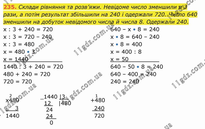 Склади рівняння та розв’яжи. Невідоме число зменшили в 3 рази, а потім результат збільшили на 240 і одержали 720. Число 640 зменшили на добуток невідомого числа й числа 8. Одержали 240. х : 3 + 240 = 720 х : 3 = 720 – 240 х : 3 = 480 х = 480 • 3 х = 1440__________ 1440 : 3 + 240 = 720 480 + 240 = 720 720 = 720 640 – х • 8 = 240 х • 8 = 640 – 240 х • 8 = 400 х = 400 : 8 х = 50_________ 640 – 50 • 8 = 240 640 – 400 = 240 240 = 240