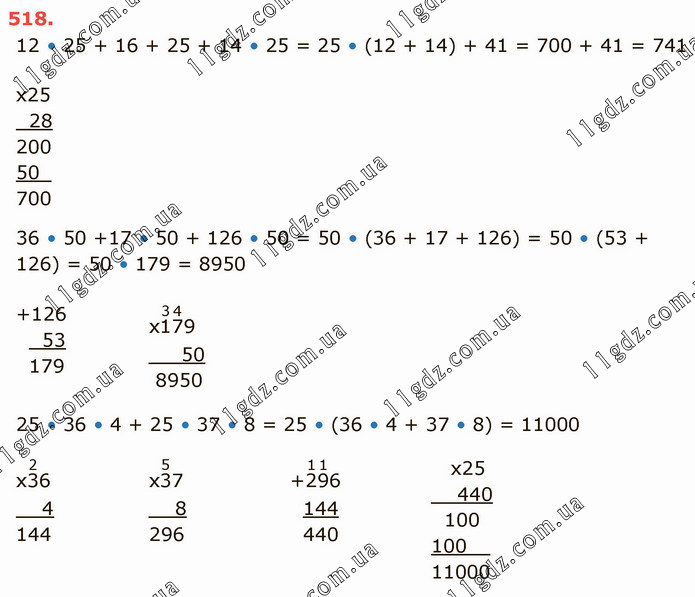 12 • 25 + 16 + 25 + 14 • 25 = 25 • (12 + 14) + 41 = 700 + 41 = 741 36 • 50 +17 • 50 + 126 • 50 = 50 • (36 + 17 + 126) = 50 • (53 + 126) = 50 • 179 = 8950 25 • 36 • 4 + 25 • 37 • 8 = 25 • (36 • 4 + 37 • 8) = 11000