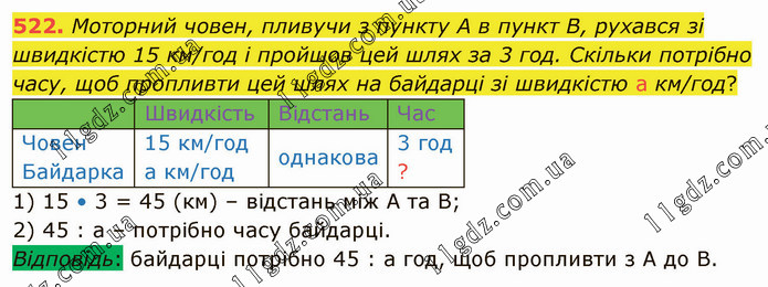 Моторний човен, пливучи з пункту А в пункт В, рухався зі швидкістю 15 км/год і пройшов цей шлях за 3 год. Скільки потрібно часу, щоб пропливти цей шлях на байдарці зі швидкістю а км/год? Швидкість Відстань Час Човен Байдарка 15 км/год а км/год однакова 3 год ? 1) 15 • 3 = 45 (км) – відстань між А та В; 2) 45 : а – потрібно часу байдарці. Відповідь: байдарці потрібно 45 : а год, щоб пропливти з А до В.