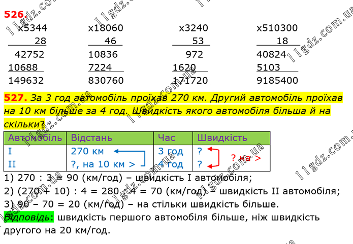 За 3 год автомобіль проїхав 270 км. Другий автомобіль проїхав на 10 км більше за 4 год. Швидкість якого автомобіля більша й на скільки? 1) 270 : 3 = 90 (км/год) – швидкість І автомобіля; 2) (270 + 10) : 4 = 280 : 4 = 70 (км/год) – швидкість ІІ автомобіля; 3) 90 – 70 = 20 (км/год) – на стільки швидкість більше. Відповідь: швидкість першого автомобіля більше, ніж швидкість другого на 20 км/год.