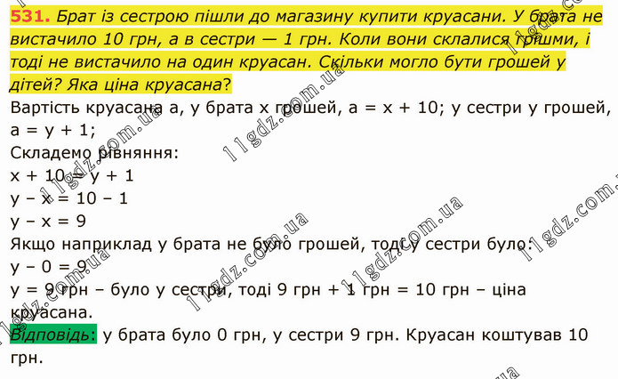 Брат із сестрою пішли до магазину купити круасани. У брата не вистачило 10 грн, а в сестри — 1 грн. Коли вони склалися грішми, і тоді не вистачило на один круасан. Скільки могло бути грошей у дітей? Яка ціна круасана? Вартість круасана а, у брата х грошей, а = х + 10; у сестри у грошей, а = у + 1; Складемо рівняння: х + 10 = у + 1 у – х = 10 – 1 у – х = 9 Якщо наприклад у брата не було грошей, тоді у сестри було: у – 0 = 9 у = 9 грн – було у сестри, тоді 9 грн + 1 грн = 10 грн – ціна круасана. Відповідь: у брата було 0 грн, у сестри 9 грн. Круасан коштував 10 грн.