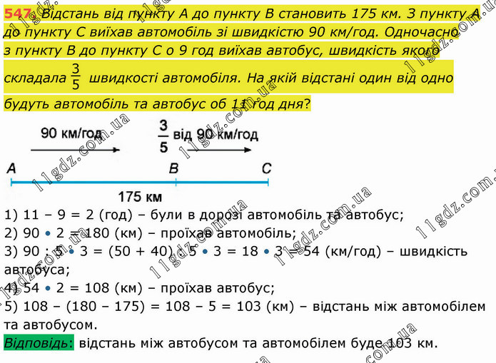 Відстань від пункту А до пункту В становить 175 км. З пункту А до пункту С виїхав автомобіль зі швидкістю 90 км/год. Одночасно з пункту В до пункту С о 9 год виїхав автобус, швидкість якого складала 3/5 швидкості автомобіля. На якій відстані один від одно будуть автомобіль та автобус об 11 год дня? 1) 11 – 9 = 2 (год) – були в дорозі автомобіль та автобус; 2) 90 • 2 = 180 (км) – проїхав автомобіль; 3) 90 : 5 • 3 = (50 + 40) : 5 • 3 = 18 • 3 = 54 (км/год) – швидкість автобуса; 4) 54 • 2 = 108 (км) – проїхав автобус; 5) 108 – (180 – 175) = 108 – 5 = 103 (км) – відстань між автомобілем та автобусом. Відповідь: відстань між автобусом та автомобілем буде 103 км.