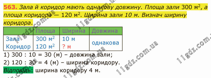 Зала й коридор мають однакову довжину. Площа зали 300 м2, а площа коридора — 120 м2. Ширина зали 10 м. Визнач ширину коридора. Площа Ширина Довжина Зала Коридор 300 м2 120 м2 10 м ? м однакова 1) 300 : 10 = 30 (м) – довжина зали; 2) 120 : 30 = 4 (м) – ширина коридору. Відповідь: ширина коридору 4 м.