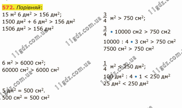 Порівняй: 15 м2 6 дм2 > 156 дм2; 1500 дм2 + 6 дм2 > 156 дм2 1506 дм2 > 156 дм2 3/4 м2 > 750 см2; 3/4 • 10000 см2 > 750 см2 10000 : 4 • 3 см2 > 750 см2 7500 см2 > 750 см2 6 м2 > 6000 см2; 60000 см2 > 6000 см2 1/4 м2 < 250 дм2; 100 дм2 : 4 • 1 < 250 дм2 25 дм2 < 250 дм2 5 дм2 = 500 см2. 500 см2 = 500 см2