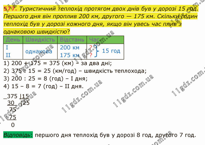 Туристичний теплохід протягом двох днів був у дорозі 15 год. Першого дня він проплив 200 км, другого — 175 км. Скільки годин теплохід був у дорозі кожного дня, якщо він увесь час плив з однаковою швидкістю? День Швидкість Відстань Час І ІІ однакова 200 км 175 км ? ? 1) 200 + 175 = 375 (км) – за два дні; 2) 375 : 15 = 25 (км/год) – швидкість теплохода; 3) 200 : 25 = 8 (год) – І дня; 4) 15 – 8 = 7 (год) – ІІ дня. Відповідь: першого дня теплохід був у дорозі 8 год, другого 7 год.