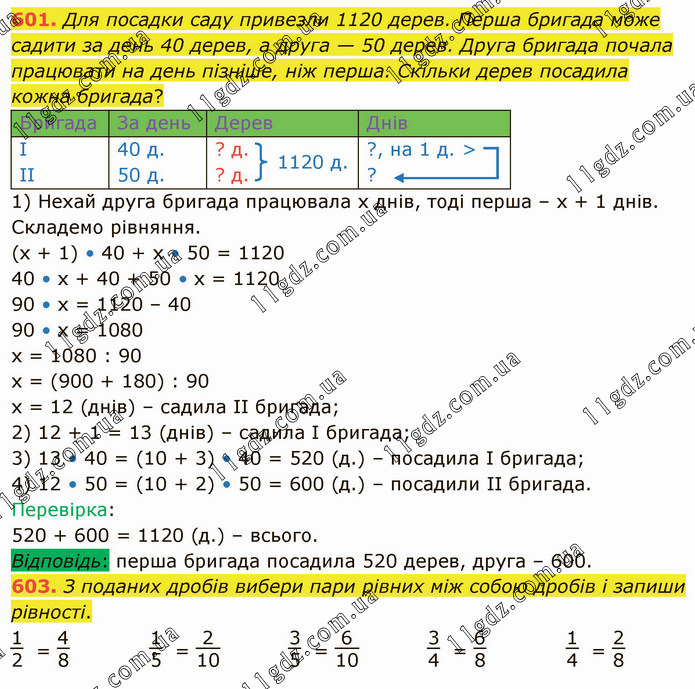 Для посадки саду привезли 1120 дерев. Перша бригада може садити за день 40 дерев, а друга — 50 дерев. Друга бригада почала працювати на день пізніше, ніж перша. Скільки дерев посадила кожна бригада? Бригада За день Дерев Днів І ІІ 40 д. 50 д. ? д. ? д. ?, на 1 д. > ? 1) Нехай друга бригада працювала х днів, тоді перша – х + 1 днів. Складемо рівняння. (х + 1) • 40 + х • 50 = 1120 40 • х + 40 + 50 • х = 1120 90 • х = 1120 – 40 90 • х = 1080 х = 1080 : 90 х = (900 + 180) : 90 х = 12 (днів) – садила ІІ бригада; 2) 12 + 1 = 13 (днів) – садила І бригада; 3) 13 • 40 = (10 + 3) • 40 = 520 (д.) – посадила І бригада; 4) 12 • 50 = (10 + 2) • 50 = 600 (д.) – посадили ІІ бригада. Перевірка: 520 + 600 = 1120 (д.) – всього. Відповідь: перша бригада посадила 520 дерев, друга – 600. 603. З поданих дробів вибери пари рівних між собою дробів і запиши рівності. 12 = 48 15 = 210 35 = 610 34 = 68 14 = Для посадки саду привезли 1120 дерев. Перша бригада може садити за день 40 дерев, а друга — 50 дерев. Друга бригада почала працювати на день пізніше, ніж перша. Скільки дерев посадила кожна бригада? Бригада За день Дерев Днів І ІІ 40 д. 50 д. ? д. ? д. ?, на 1 д. > ? 1) Нехай друга бригада працювала х днів, тоді перша – х + 1 днів. Складемо рівняння. (х + 1) • 40 + х • 50 = 1120 40 • х + 40 + 50 • х = 1120 90 • х = 1120 – 40 90 • х = 1080 х = 1080 : 90 х = (900 + 180) : 90 х = 12 (днів) – садила ІІ бригада; 2) 12 + 1 = 13 (днів) – садила І бригада; 3) 13 • 40 = (10 + 3) • 40 = 520 (д.) – посадила І бригада; 4) 12 • 50 = (10 + 2) • 50 = 600 (д.) – посадили ІІ бригада. Перевірка: 520 + 600 = 1120 (д.) – всього. Відповідь: перша бригада посадила 520 дерев, друга – 600. 603. З поданих дробів вибери пари рівних між собою дробів і запиши рівності. 1/2 = 4/8 1/5 = 2/10 3/5 = 6/10 3/4 = 6/8 1/4 = 2/8