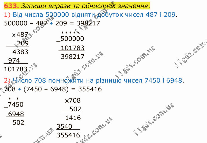 Запиши вирази та обчисли їх значення. 1) Від числа 500000 відняти добуток чисел 487 і 209. 500000 – 487 • 209 = 398217 2) Число 708 помножити на різницю чисел 7450 і 6948. 708 • (7450 – 6948) = 355416