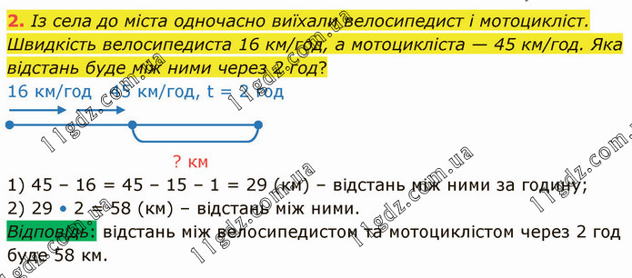 Із села до міста одночасно виїхали велосипедист і мотоцикліст. Швидкість велосипедиста 16 км/год, а мотоцикліста — 45 км/год. Яка відстань буде між ними через 2 год? 16 км/год 45 км/год, t = 2 год ? км 1) 45 – 16 = 45 – 15 – 1 = 29 (км) – відстань між ними за годину; 2) 29 • 2 = 58 (км) – відстань між ними. Відповідь: відстань між велосипедистом та мотоциклістом через 2 год буде 58 км.