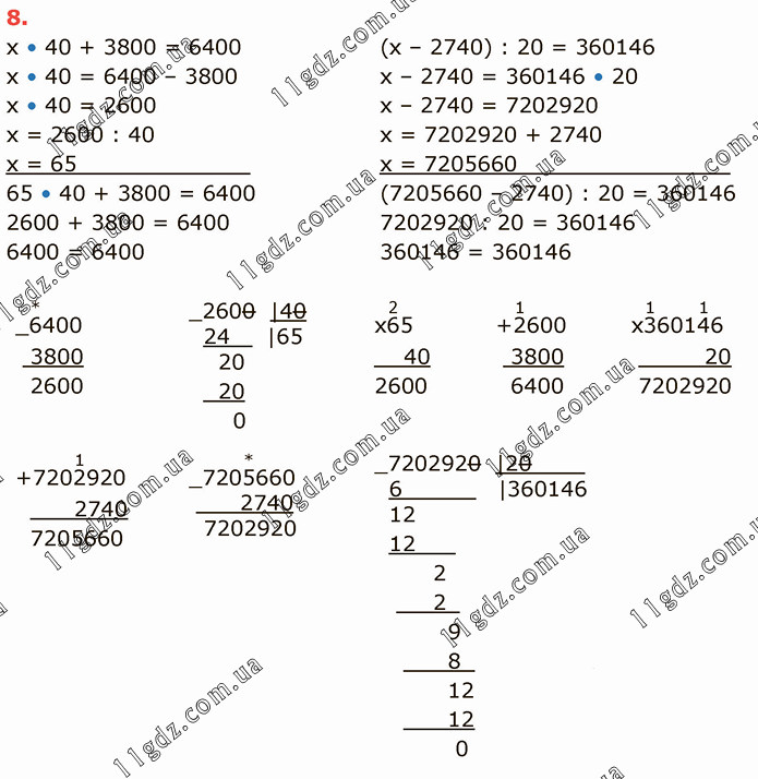 х • 40 + 3800 = 6400 х • 40 = 6400 – 3800 х • 40 = 2600 х = 2600 : 40 х = 65_____________ 65 • 40 + 3800 = 6400 2600 + 3800 = 6400 6400 = 6400 (х – 2740) : 20 = 360146 х – 2740 = 360146 • 20 х – 2740 = 7202920 х = 7202920 + 2740 х = 7205660________________ (7205660 – 2740) : 20 = 360146 7202920 : 20 = 360146 360146 = 360146