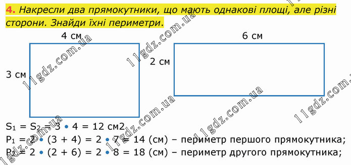 Накресли два прямокутники, що мають однакові площі, але різні сторони. Знайди їхні периметри. 4 см 6 см 2 см 3 см S1 = S2 = 3 • 4 = 12 см2 Р1 = 2 • (3 + 4) = 2 • 7 = 14 (см) – периметр першого прямокутника; Р2 = 2 • (2 + 6) = 2 • 8 = 18 (см) – периметр другого прямокутника;