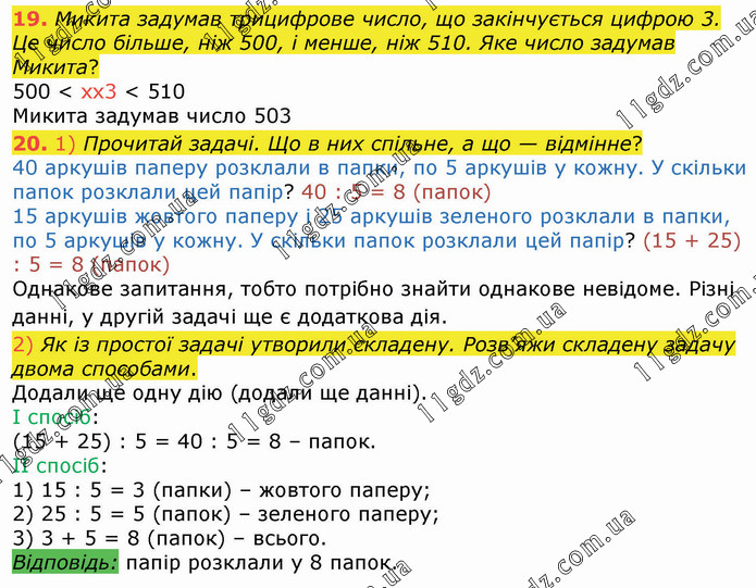 Микита задумав трицифрове число, що закінчується цифрою 3. Це число більше, ніж 500, і менше, ніж 510. Яке число задумав Микита? 500 < xx3 < 510 Микита задумав число 503 20. 1) Прочитай задачі. Що в них спільне, а що — відмінне? 40 аркушів паперу розклали в папки, по 5 аркушів у кожну. У скільки папок розклали цей папір? 40 : 5 = 8 (папок) 15 аркушів жовтого паперу і 25 аркушів зеленого розклали в папки, по 5 аркушів у кожну. У скільки папок розклали цей папір? (15 + 25) : 5 = 8 (папок) Однакове запитання, тобто потрібно знайти однакове невідоме. Різні данні, у другій задачі ще є додаткова дія. 2) Як із простої задачі утворили складену. Розв’яжи складену задачу двома способами. Додали ще одну дію (додали ще данні).