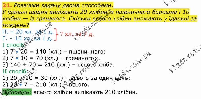 Розв’яжи задачу двома способами. У їдальні щодня випікають 20 хлібин із пшеничного борошна і 10 хлібин — із гречаного. Скільки всього хлібин випікають у їдальні за тиждень?