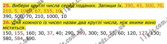 Вибери круглі числа серед поданих. Запиши їх. 390, 45, 500, 70, 210, 5, 1000, 67, 555, 10. 390, 500, 70, 210, 1000, 10 26. Для кожного із чисел назви два круглі числа, між якими воно міститься. 150, 155, 160; 30, 37, 40; 290, 299, 300; 50, 55, 60; 120, 127, 130; 580, 584, 590.