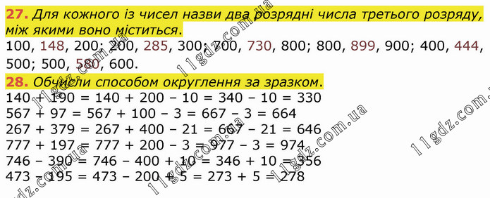 Для кожного із чисел назви два розрядні числа третього розряду, між якими воно міститься. 100, 148, 200; 200, 285, 300; 700, 730, 800; 800, 899, 900; 400, 444, 500; 500, 580, 600. 28. Обчисли способом округлення за зразком. 140 + 190 = 140 + 200 – 10 = 340 – 10 = 330 567 + 97 = 567 + 100 – 3 = 667 – 3 = 664 267 + 379 = 267 + 400 – 21 = 667 – 21 = 646 777 + 197 = 777 + 200 – 3 = 977 – 3 = 974 746 – 390 = 746 – 400 + 10 = 346 + 10 = 356 473 – 195 = 473 – 200 + 5 = 273 + 5 = 278