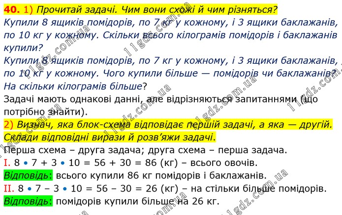 1) Прочитай задачі. Чим вони схожі й чим різняться? Купили 8 ящиків помідорів, по 7 кг у кожному, і 3 ящики баклажанів, по 10 кг у кожному. Скільки всього кілограмів помідорів і баклажанів купили? Купили 8 ящиків помідорів, по 7 кг у кожному, і 3 ящики баклажанів, по 10 кг у кожному. Чого купили більше — помідорів чи баклажанів? На скільки кілограмів більше? Задачі мають однакові данні, але відрізняються запитаннями (що потрібно знайти). 2) Визнач, яка блоксхема відповідає першій задачі, а яка — другій. Склади відповідні вирази й розв’яжи задачі. Перша схема – друга задача; друга схема – перша задача. І. 8 • 7 + 3 • 10 = 56 + 30 = 86 (кг) – всього овочів. Відповідь: всього купили 86 кг помідорів і баклажанів. ІІ. 8 • 7 – 3 • 10 = 56 – 30 = 26 (кг) – на стільки більше помідорів. Відповідь: помідорів купили більше на 26 кг.