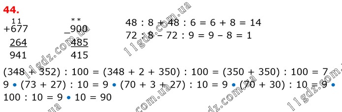 48 : 8 + 48 : 6 = 6 + 8 = 14 72 : 8 – 72 : 9 = 9 – 8 = 1 (348 + 352) : 100 = (348 + 2 + 350) : 100 = (350 + 350) : 100 = 7 9 • (73 + 27) : 10 = 9 • (70 + 3 + 27) : 10 = 9 • (70 + 30) : 10 = 9 • 100 : 10 = 9 • 10 = 90