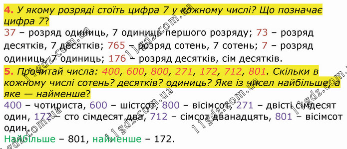 У якому розряді стоїть цифра 7 у кожному числі? Що позначає цифра 7? 37 – розряд одиниць, 7 одиниць першого розряду; 73 – розряд десятків, 7 десятків; 765 – розряд сотень, 7 сотень; 7 – розряд одиниць, 7 одиниць; 176 – розряд десятків, сім десятків. 5. Прочитай числа: 400, 600, 800, 271, 172, 712, 801. Скільки в кожному числі сотень? десятків? одиниць? Яке із чисел найбільше, а яке — найменше? 400 – чотириста, 600 – шістсот, 800 – вісімсот, 271 – двісті сімдесят один, 172 – сто сімдесят два, 712 – сімсот дванадцять, 801 – вісімсот один. Найбільше – 801, найменше – 172.