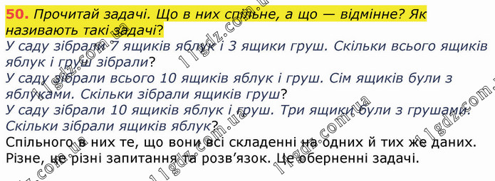 Прочитай задачі. Що в них спільне, а що — відмінне? Як називають такі задачі? У саду зібрали 7 ящиків яблук і 3 ящики груш. Скільки всього ящиків яблук і груш зібрали? У саду зібрали всього 10 ящиків яблук і груш. Сім ящиків були з яблуками. Скільки зібрали ящиків груш? У саду зібрали 10 ящиків яблук і груш. Три ящики були з грушами. Скільки зібрали ящиків яблук? Спільного в них те, що вони всі складенні на одних й тих же даних. Різне, це різні запитання та розв’язок. Це оберненні задачі.