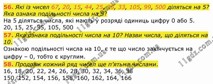 Які із чисел 67, 20, 15, 44, 25, 35, 33, 105, 99, 500 діляться на 5? Яка ознака подільності числа на 5? На 5 діляться числа, які мають у розряді одиниць цифру 0 або 5. 20, 15, 25, 35, 105, 500 57. Яка ознака подільності числа на 10? Назви числа, що діляться на 10. Ознакою подільності числа на 10, є те що число закінчується на цифру – 0, тобто є круглим. 58. Продовж кожний ряд чисел ще п’ятьма числами. 16, 18, 20, 22, 24, 26, 28, 30, 32, 34, 36, 38 150, 152, 154, 156, 158, 160, 162, 164, 166