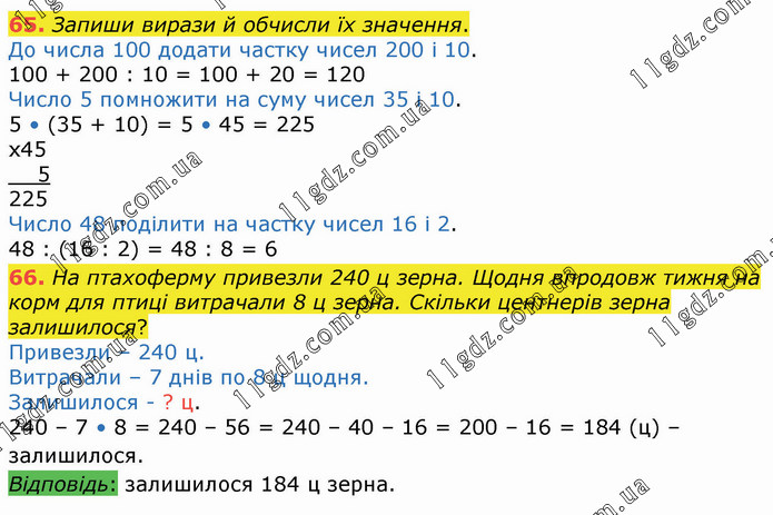 Запиши вирази й обчисли їх значення. До числа 100 додати частку чисел 200 і 10. 100 + 200 : 10 = 100 + 20 = 120 Число 5 помножити на суму чисел 35 і 10. 5 • (35 + 10) = 5 • 45 = 225 х45 5 225 Число 48 поділити на частку чисел 16 і 2. 48 : (16 : 2) = 48 : 8 = 6 66. На птахоферму привезли 240 ц зерна. Щодня впродовж тижня на корм для птиці витрачали 8 ц зерна. Скільки центнерів зерна залишилося? Привезли – 240 ц. Витрачали – 7 днів по 8 ц щодня. Залишилося - ? ц. 240 – 7 • 8 = 240 – 56 = 240 – 40 – 16 = 200 – 16 = 184 (ц) – залишилося. Відповідь: залишилося 184 ц зерна.