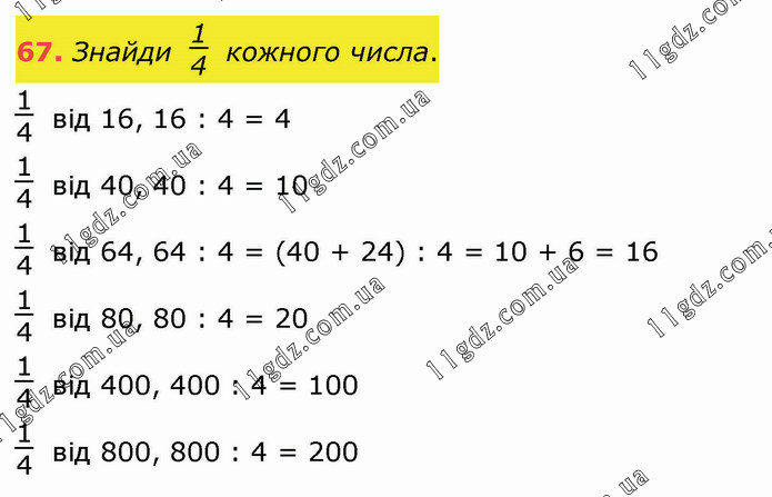 Знайди 1/4 кожного числа. 1/4 від 16, 16 : 4 = 4 1/4 від 40, 40 : 4 = 10 1/4 від 64, 64 : 4 = (40 + 24) : 4 = 10 + 6 = 16 1/4 від 80, 80 : 4 = 20 1/4 від 400, 400 : 4 = 100 1/4 від 800, 800 : 4 = 200