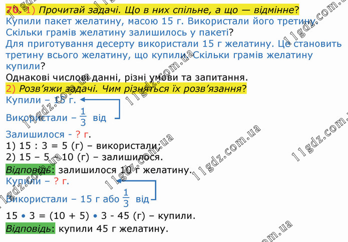 Прочитай задачі. Що в них спільне, а що — відмінне? Купили пакет желатину, масою 15 г. Використали його третину. Скільки грамів желатину залишилось у пакеті? Для приготування десерту використали 15 г желатину. Це становить третину всього желатину, що купили. Скільки грамів желатину купили? Однакові числові данні, різні умови та запитання. 2) Розв’яжи задачі. Чим різняться їх розв’язання? Купили – 15 г. Використали – 13 від Залишилося - ? г. 1) 15 : 3 = 5 (г) – використали; 2) 15 – 5 – 10 (г) – залишилося. Відповідь: залишилося 10 г желатину.