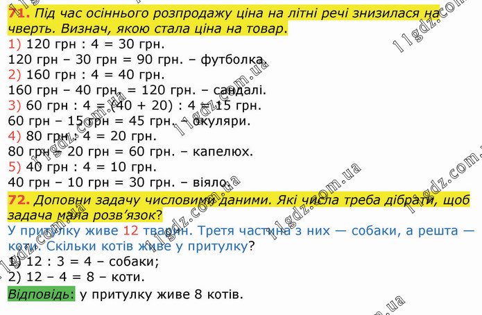 Під час осіннього розпродажу ціна на літні речі знизилася на чверть. Визнач, якою стала ціна на товар. 1) 120 грн : 4 = 30 грн. 120 грн – 30 грн = 90 грн. – футболка. 2) 160 грн : 4 = 40 грн. 160 грн – 40 грн. = 120 грн. – сандалі. 3) 60 грн : 4 = (40 + 20) : 4 = 15 грн. 60 грн – 15 грн = 45 грн. – окуляри. 4) 80 грн : 4 = 20 грн. 80 грн – 20 грн = 60 грн. – капелюх. 5) 40 грн : 4 = 10 грн. 40 грн – 10 грн = 30 грн. – віяло. 72. Доповни задачу числовими даними. Які числа треба дібрати, щоб задача мала розв’язок? У притулку живе 12 тварин. Третя частина з них — собаки, а решта — коти. Скільки котів живе у притулку? 1) 12 : 3 = 4 – собаки; 2) 12 – 4 = 8 – коти. Відповідь: у притулку живе 8 котів.