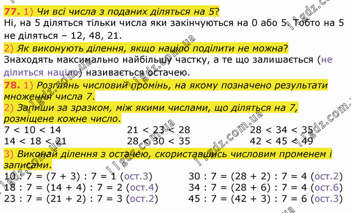 1) Чи всі числа з поданих діляться на 5? Ні, на 5 діляться тільки числа яки закінчуються на 0 або 5. Тобто на 5 не діляться – 12, 48, 21. 2) Як виконують ділення, якщо націло поділити не можна? Знаходять максимально найбільшу частку, а те що залишається (не ділиться націло) називається остачею. 78. 1) Розглянь числовий промінь, на якому позначено результати множення числа 7. 2) Запиши за зразком, між якими числами, що діляться на 7, розміщене кожне число. 7 < 10 < 14 14 < 18 < 21 21 < 23 < 28 28 < 30 < 35 28 < 34 < 35 42 < 45 < 49 3) Виконай ділення з остачею, скориставшись числовим променем і записами. 10 : 7 = (7 + 3) : 7 = 1 (ост.3) 18 : 7 = (14 + 4) : 7 = 2 (ост.4) 23 : 7 = (21 + 2) : 7 = 3 (ост.2) 30 : 7 = (28 + 2) : 7 = 4 (ост.2) 34 : 7 = (28 + 6) : 7 = 4 (ост.6) 45 : 7 = (42 + 3) : 7 = 6 (ост.3)