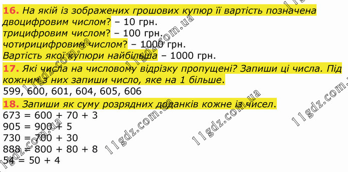 На якій із зображених грошових купюр її вартість позначена двоцифровим числом? – 10 грн. трицифровим числом? – 100 грн. чотирицифровим числом? – 1000 грн. Вартість якої купюри найбільша – 1000 грн. 17. Які числа на числовому відрізку пропущені? Запиши ці числа. Під кожним з них запиши число, яке на 1 більше. 599, 600, 601, 604, 605, 606 18. Запиши як суму розрядних доданків кожне із чисел. 673 = 600 + 70 + 3 905 = 900 + 5 730 = 700 + 30 888 = 800 + 80 + 8 54 = 50 + 4