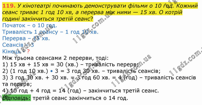 У кінотеатрі починають демонструвати фільми о 10 год. Кожний сеанс триває 1 год 10 хв, а перерва між ними — 15 хв. О котрій годині закінчиться третій сеанс? Початок – о 10 год. Тривалість 1 сеансу – 1 год 10 хв. Перерва – 15 хв. Сеансів – 3 Кінець - ?