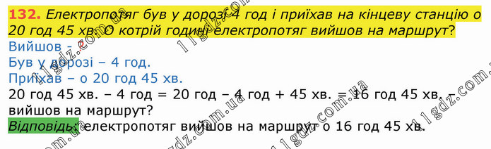 Електропотяг був у дорозі 4 год і приїхав на кінцеву станцію о 20 год 45 хв. О котрій годині електропотяг вийшов на маршрут? Вийшов - ? Був у дорозі – 4 год. Приїхав – о 20 год 45 хв.
