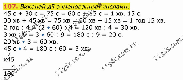 Виконай дії з іменованими числами. 45 с + 30 с = 75 с = 60 с + 15 с = 1 хв. 15 с 30 хв + 45 хв = 75 хв = 60 хв + 15 хв = 1 год 15 хв. 2 год : 4 = (2 • 60) : 4 = 120 хв : 4 = 30 хв. 3 хв : 9 = 3 • 60 : 9 = 180 с : 9 = 20 с. 20 хв • 3 = 60 хв. 45 с • 4 = 180 с : 60 = 3 хв.