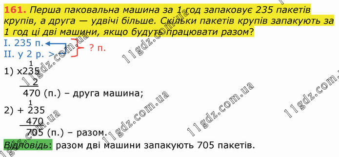 Перша паковальна машина за 1 год запаковує 235 пакетів крупів, а друга — удвічі більше. Скільки пакетів крупів запакують за 1 год ці дві машини, якщо будуть працювати разом?