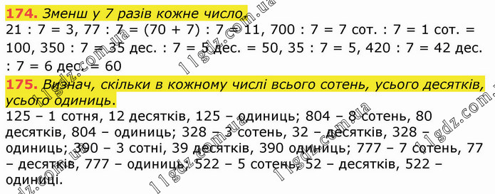Зменш у 7 разів кожне число. 21 : 7 = 3, 77 : 7 = (70 + 7) : 7 = 11, 700 : 7 = 7 сот. : 7 = 1 сот. = 100, 350 : 7 = 35 дес. : 7 = 5 дес. = 50, 35 : 7 = 5, 420 : 7 = 42 дес. : 7 = 6 дес. = 60 175. Визнач, скільки в кожному числі всього сотень, усього десятків, усього одиниць. 125 – 1 сотня, 12 десятків, 125 – одиниць; 804 – 8 сотень, 80 десятків, 804 – одиниць; 328 – 3 сотень, 32 – десятків, 328 – одиниць; 390 – 3 сотні, 39 десятків, 390 одиниць; 777 – 7 сотень, 77 – десятків, 777 – одиниць; 522 – 5 сотень, 52 – десятків, 522 – одиниці.