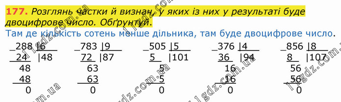 Розглянь частки й визнач, у яких із них у результаті буде двоцифрове число. Обґрунтуй. Там де кількість сотень менше дільника, там буде двоцифрове число.