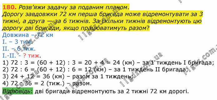 Розв’яжи задачу за поданим планом. Дорогу завдовжки 72 км перша бригада може відремонтувати за 3 тижні, а друга — за 6 тижнів. За скільки тижнів відремонтують цю дорогу дві бригади, якщо працюватимуть разом? Довжина – 72 км І. – 3 тиж. ІІ. – 6 тиж. І.-ІІ. - ? тиж. 1) 72 : 3 = (60 + 12) : 3 = 20 + 4 = 24 (км) – за 1 тиждень І бригада; 2) 72 : 6 = (60 + 12) : 6 = 12 (км) – за 1 тиждень ІІ бригада; 3) 24 + 12 = 36 (км) – разом за 1 тиждень; 4) 72 : 36 = 2 (тиж.) – разом. Відповідь: дві бригади відремонтують за 2 тижні 72 км дорогі.