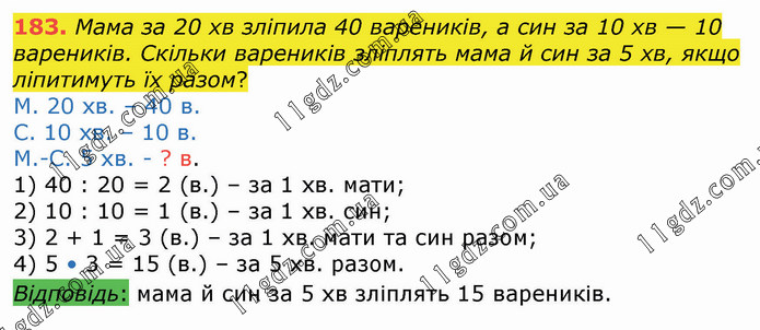 Мама за 20 хв зліпила 40 вареників, а син за 10 хв — 10 вареників. Скільки вареників зліплять мама й син за 5 хв, якщо ліпитимуть їх разом? М. 20 хв. – 40 в. С. 10 хв. – 10 в. М.-С. 5 хв. - ? в. 1) 40 : 20 = 2 (в.) – за 1 хв. мати; 2) 10 : 10 = 1 (в.) – за 1 хв. син; 3) 2 + 1 = 3 (в.) – за 1 хв. мати та син разом; 4) 5 • 3 = 15 (в.) – за 5 хв. разом. Відповідь: мама й син за 5 хв зліплять 15 вареників.
