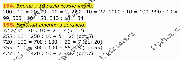Зменш у 10 разів кожне число. 200 : 10 = 20, 20 : 10 = 2, 220 : 10 = 22, 1000 : 10 = 100, 990 : 10 = 99, 500 : 10 = 50, 340 : 10 = 34 195. Виконай ділення з остачею. 72 : 10 = 70 : 10 + 2 = 7 (ост.2) 255 : 10 = 250 : 10 + 5 = 25 (ост.5) 720 : 100 = 700 : 100 + 20 = 7 (ост.20) 355 : 100 = 300 : 100 + 55 = 3 (ост.55) 427 : 10 = 420 : 10 + 7 = 42 (ост.7)
